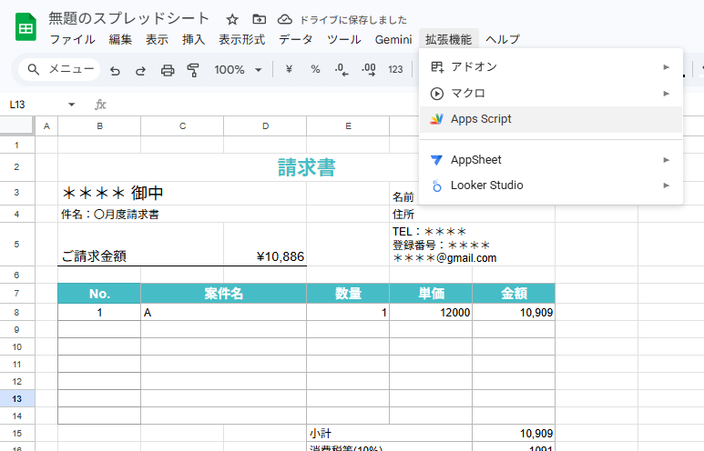 Googleスプレッドシート画面上部のメニューから [拡張機能] > [Apps Script] をクリックします。