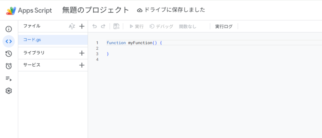 新しいタブで編集画面が開きます。最初から入力されている function myFunction() {…} という文字はすべて消して、空の状態にしてください。