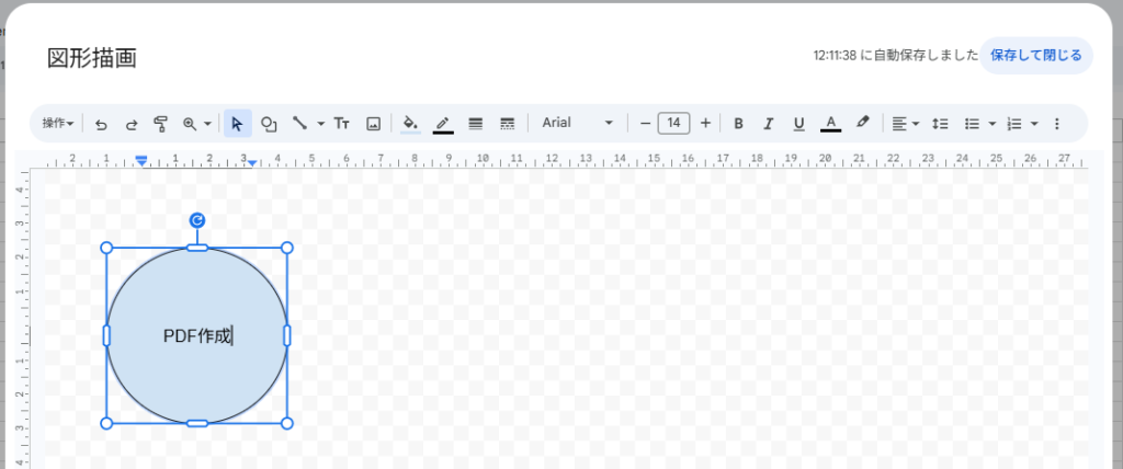 好きな図形を描き、中に「PDF作成」とテキストを入力して「保存して閉じる」を押します。