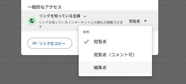 Googleスプレッドシートの「共有」設定では、ユーザーごとに「閲覧者」「閲覧者(コメント可)」「編集者」の3段階で権限を分けることができます。