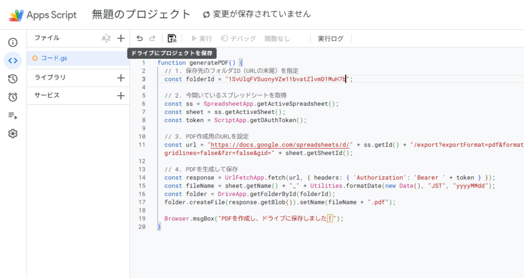 コピーした英数字を先ほどのコードの「ここにフォルダIDを貼り付け」の部分に上書きし、画面上の 「プロジェクトを保存(フロッピーアイコン)」をクリックします。