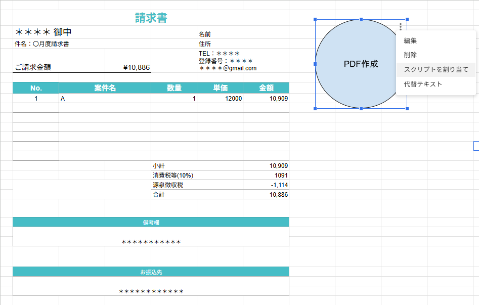 シートに配置された図形を右クリックし、三点リーダーから「スクリプトを割り当て」を選択します。入力欄に「generatePDF」と入力してOKを押してください。