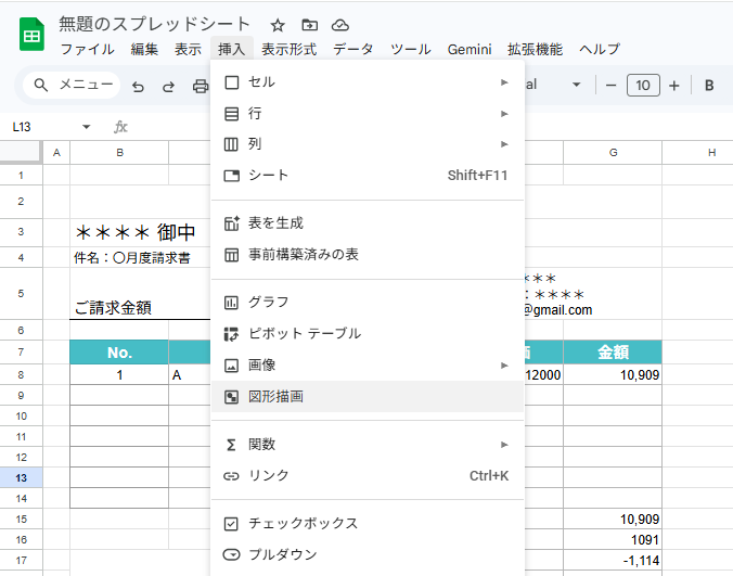 Googleスプレッドシートに戻り、メニューの [挿入] > [図形描画] を選択します。