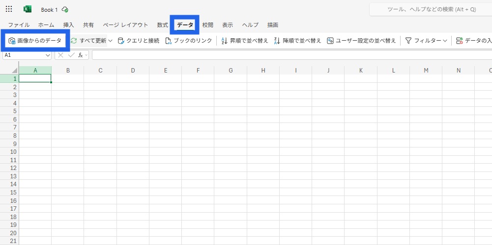 新しいExcelファイルを開き、画面上部の「データ」タブの「画像からデータ」をクリックしてください。