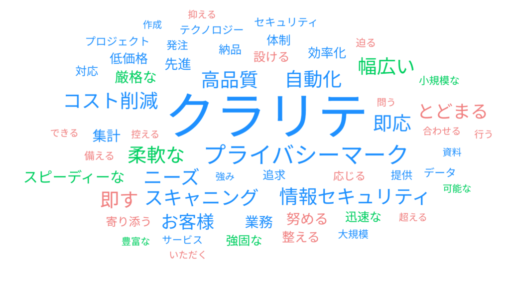 代表的な可視化手法である「ワードクラウド」では、頻出する単語ほど大きく表示されるため、一目で「何が話題になっているか」を直感的に把握できます。
