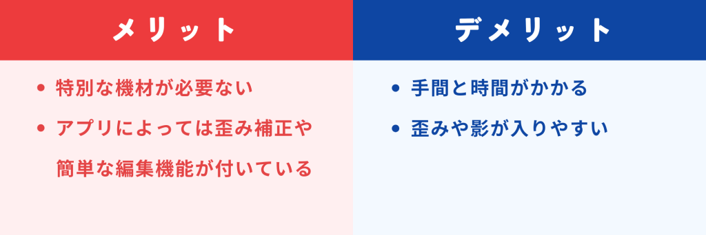 特別な機材が不要で、思い立ったらすぐに始められる点がメリットですが、大量の書類を一枚一枚撮影するのは非常に手間がかかります。