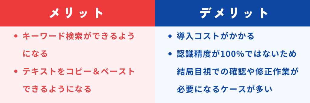 OCR機能付きのスキャナーやソフトウェア、オンラインサービスを利用してデータ化するため、導入コストがかかります。