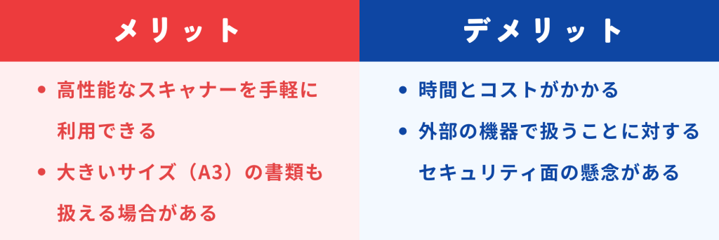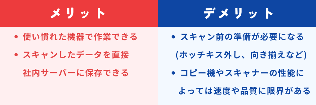 自社内のコピー機やスキャナーを使用するため、作業しやすくスキャンしたデータを保管しやすいなどのメリットがあります。