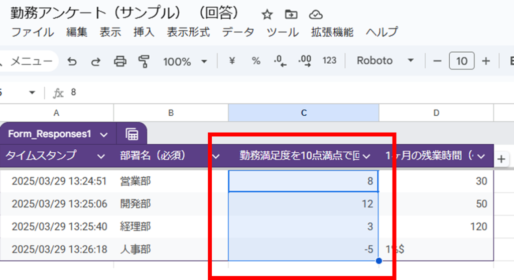 スプレッドシートには、フォームの送信時刻も自動的に記録されるため、特定の期間の集計や、回答傾向の時間分析が可能になります。