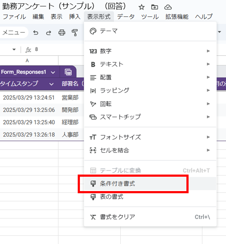 2.メニューから「表示形式 > 条件付き書式」をクリックします