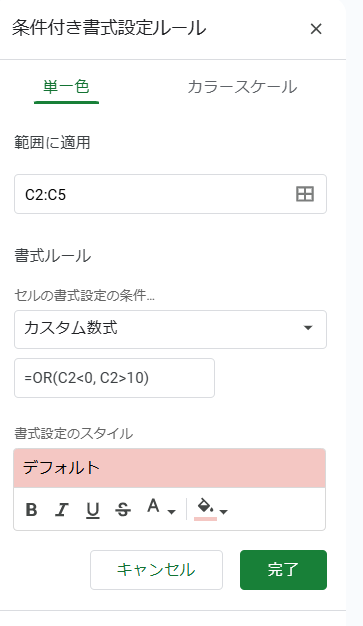 3.「条件付き書式ルール」のサイドバーが開いたら、以下のように設定します