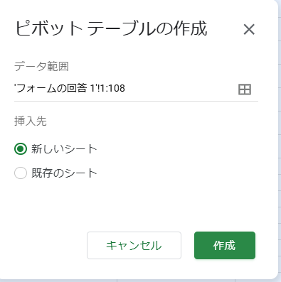 1.スプレッドシート上で回答が記録されている表全体を選択し、メニューから「挿入 > ピボットテーブル」をクリックします