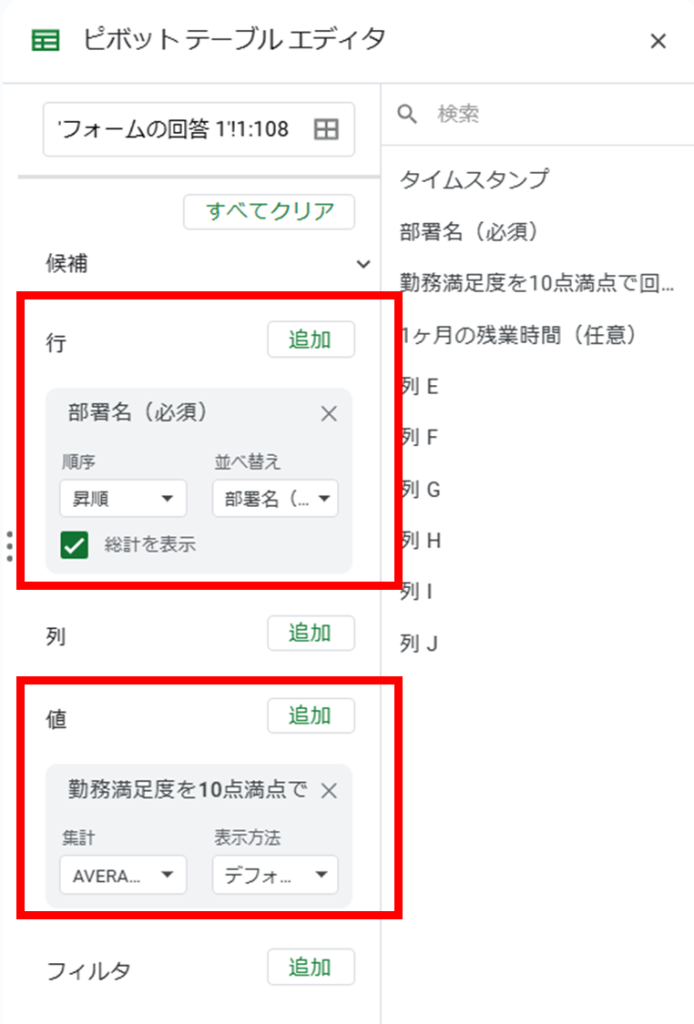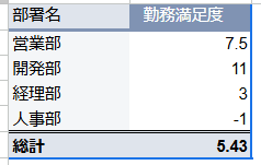 3.「行」に【部署名】、「値」に【勤務満足度】を追加し、集計を設定します