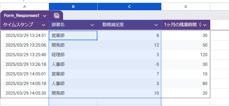 ※この例では、B列に「部署名」の回答が記録されていると仮定しています。