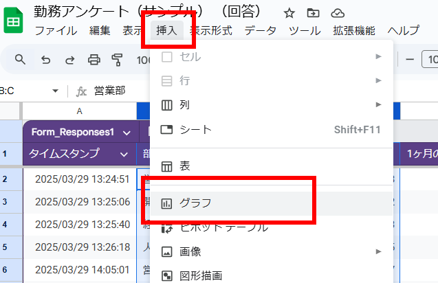 スプレッドシートに記録されたアンケート結果は、グラフ機能を使って「見てわかる」かたちに変えられます。