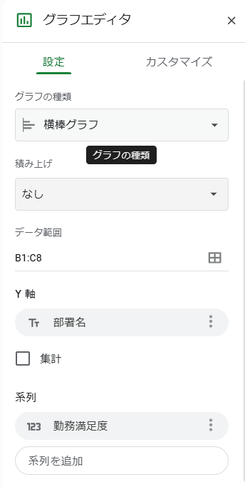 4.グラフエディタで必要に応じて、グラフの種類や色・タイトルをカスタマイズできます