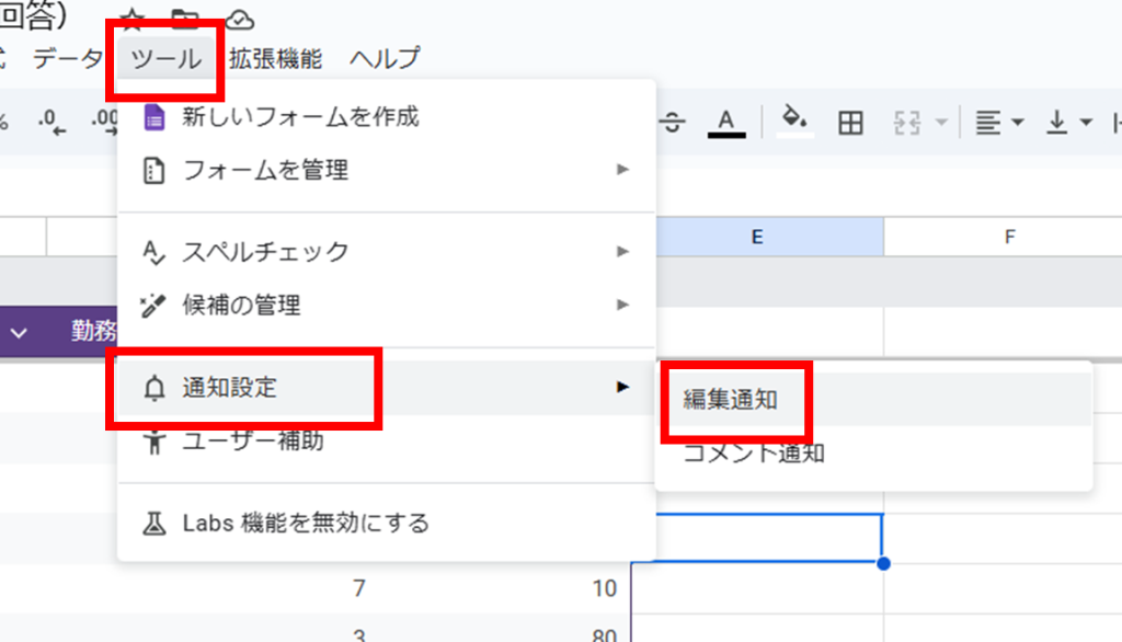 1.スプレッドシートのメニューから「ツール > 通知設定 > 編集通知」を選択します
