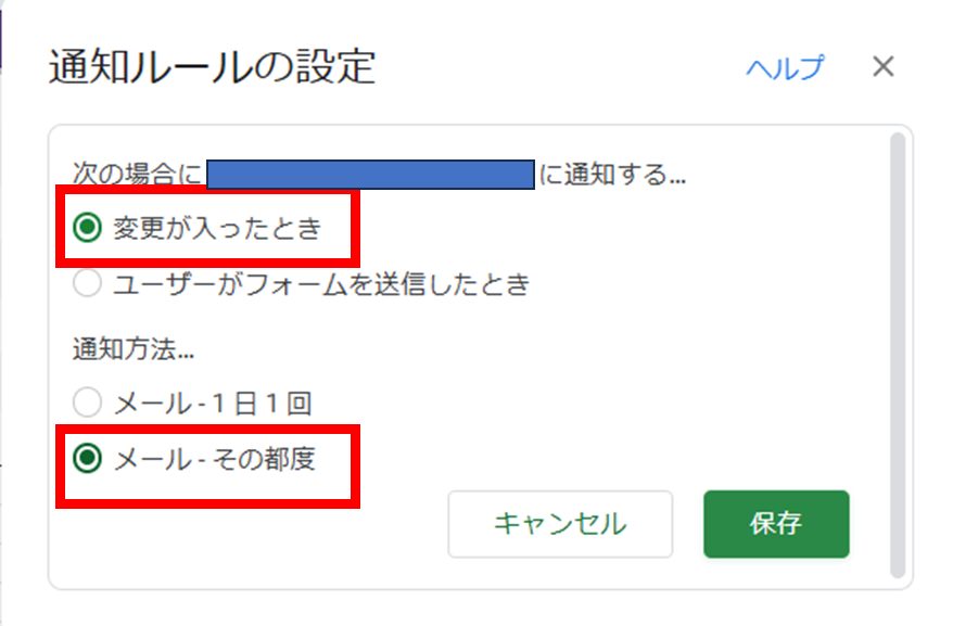 2.「変更が入ったとき」、「メールーその都度」を選択します