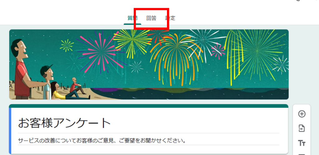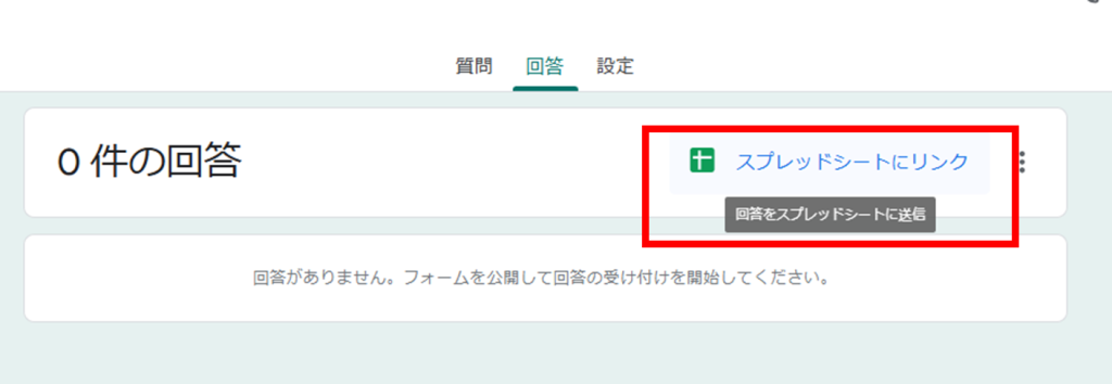 画面上部の「質問」「回答」「設定」のうち、「回答」タブをクリックします。