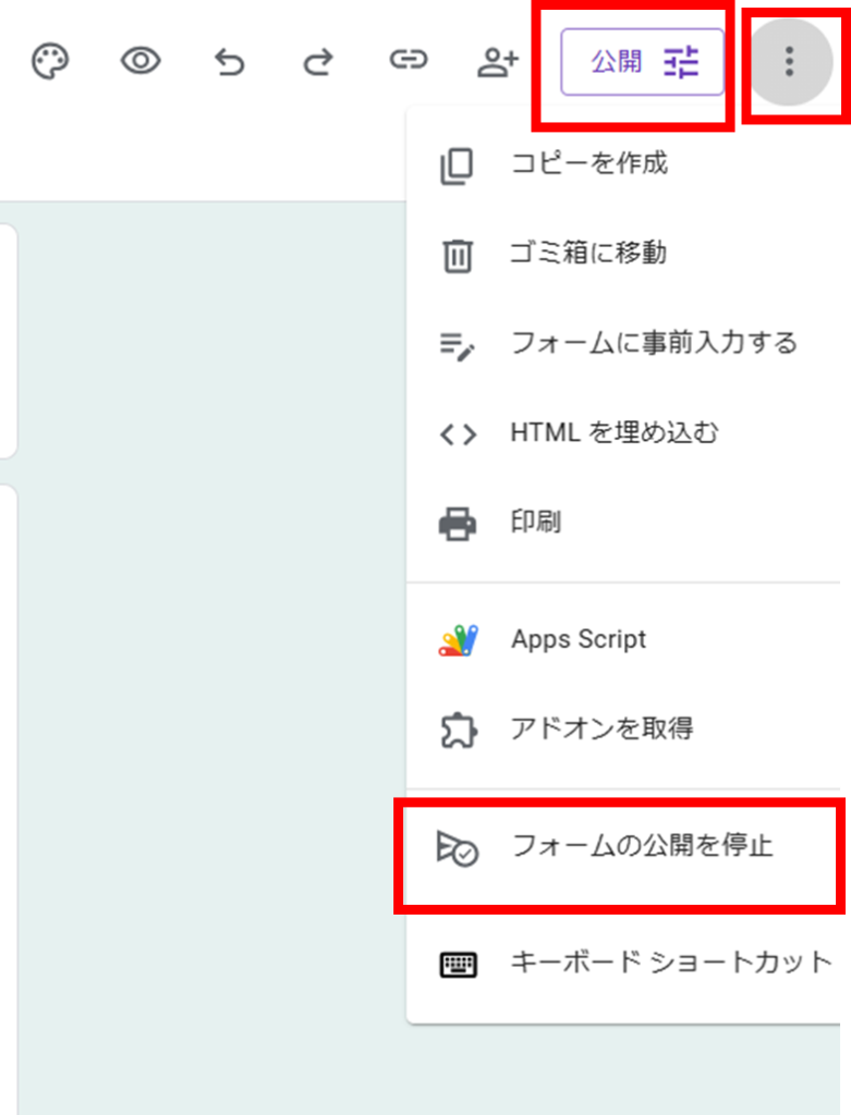 「回答」タブの右上にある3点マーク(︙)または公開から、フォームの公開を停止し、回答の受け付けを終了することも可能です。