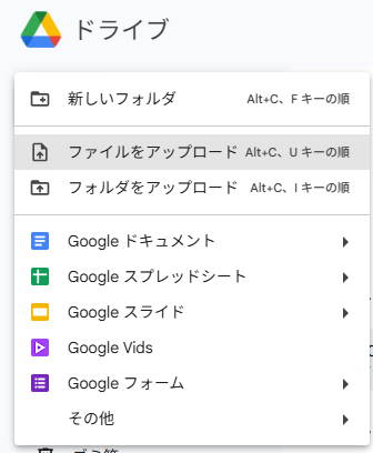 次に、変換対象となるExcelファイルをGoogleドライブへアップロードします。