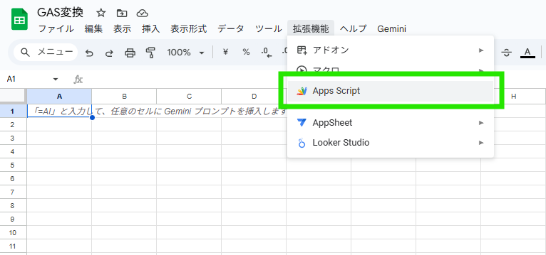 確認したコードを、Googleスプレッドシートの「拡張機能」メニューから開けるApps Scriptエディタに貼り付けます。