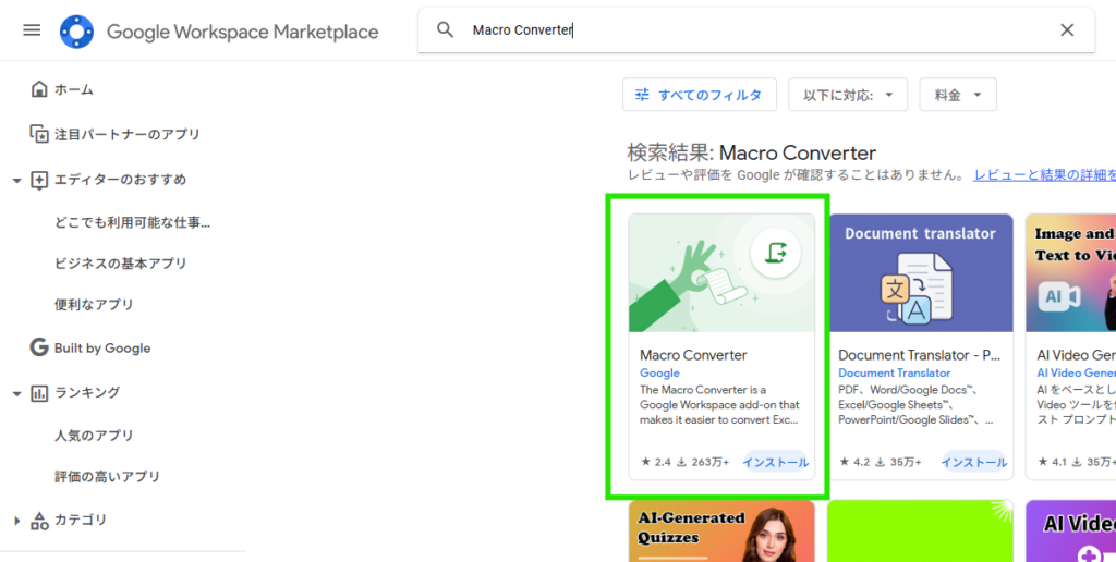 「Google Workspace Marketplace」にアクセスし、検索窓に「Macro Converter」と入力してインストールを開始してください。
